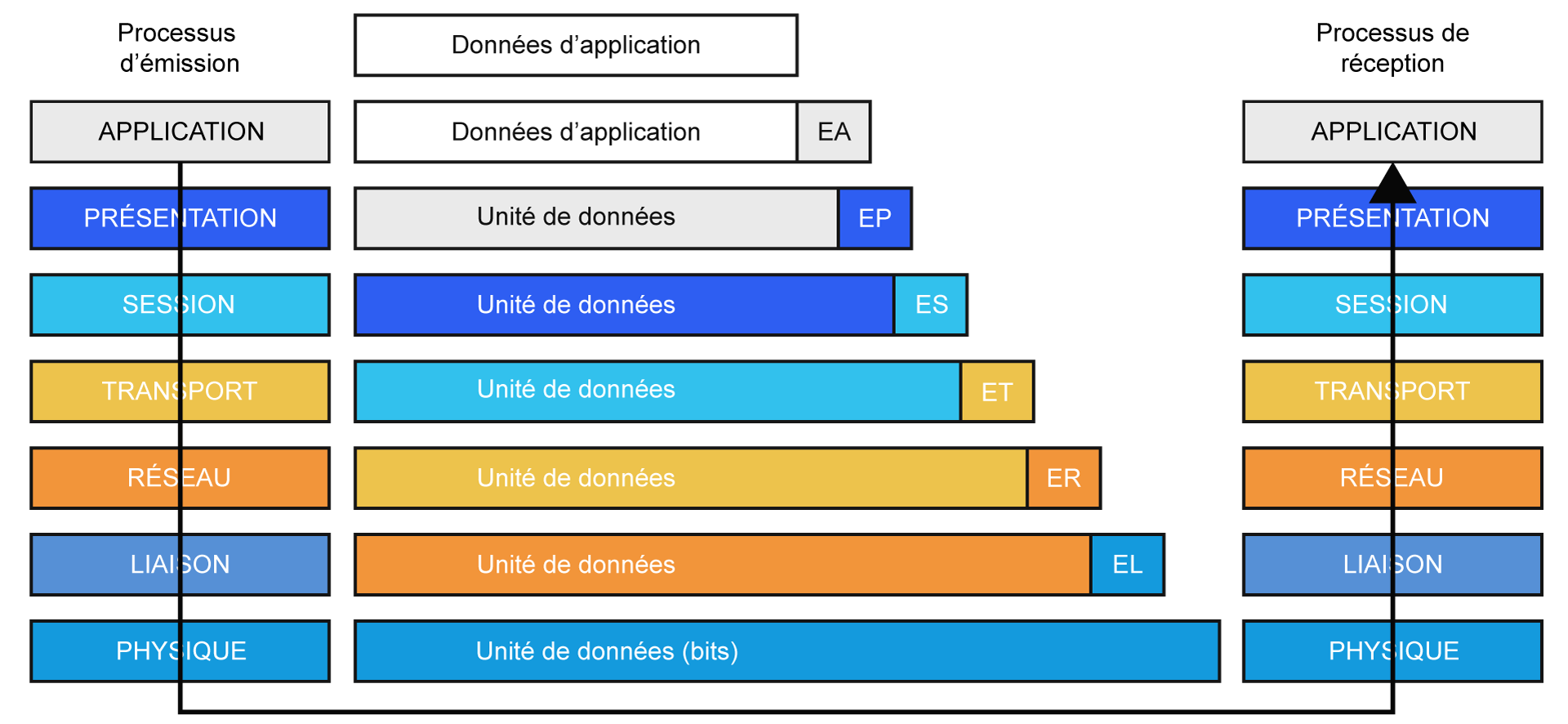 Dans une communication OSI, les données traversent les couches de haut en bas chez l'expéditeur (avec ajout d'en-têtes), puis de bas en haut chez le destinataire (chaque couche vérifiant son en-tête).