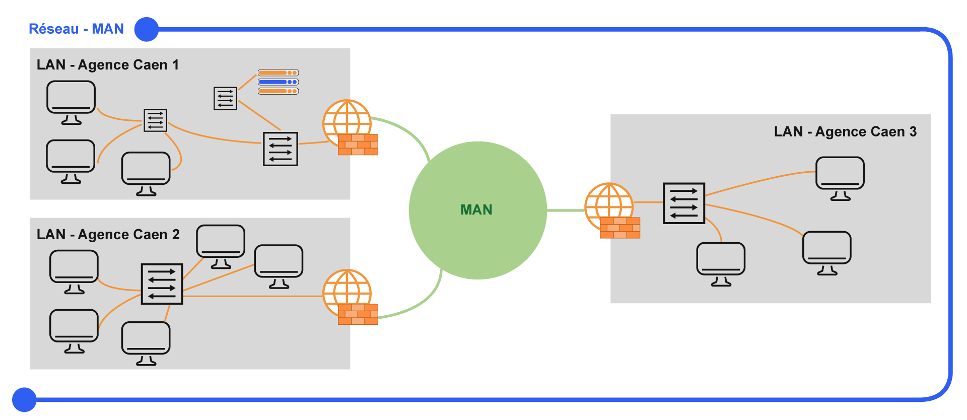En fait, ces différents réseaux locaux (LAN) dispersés dans une ville, sont physiquement reliés entre eux pour constituer le réseau MAN.