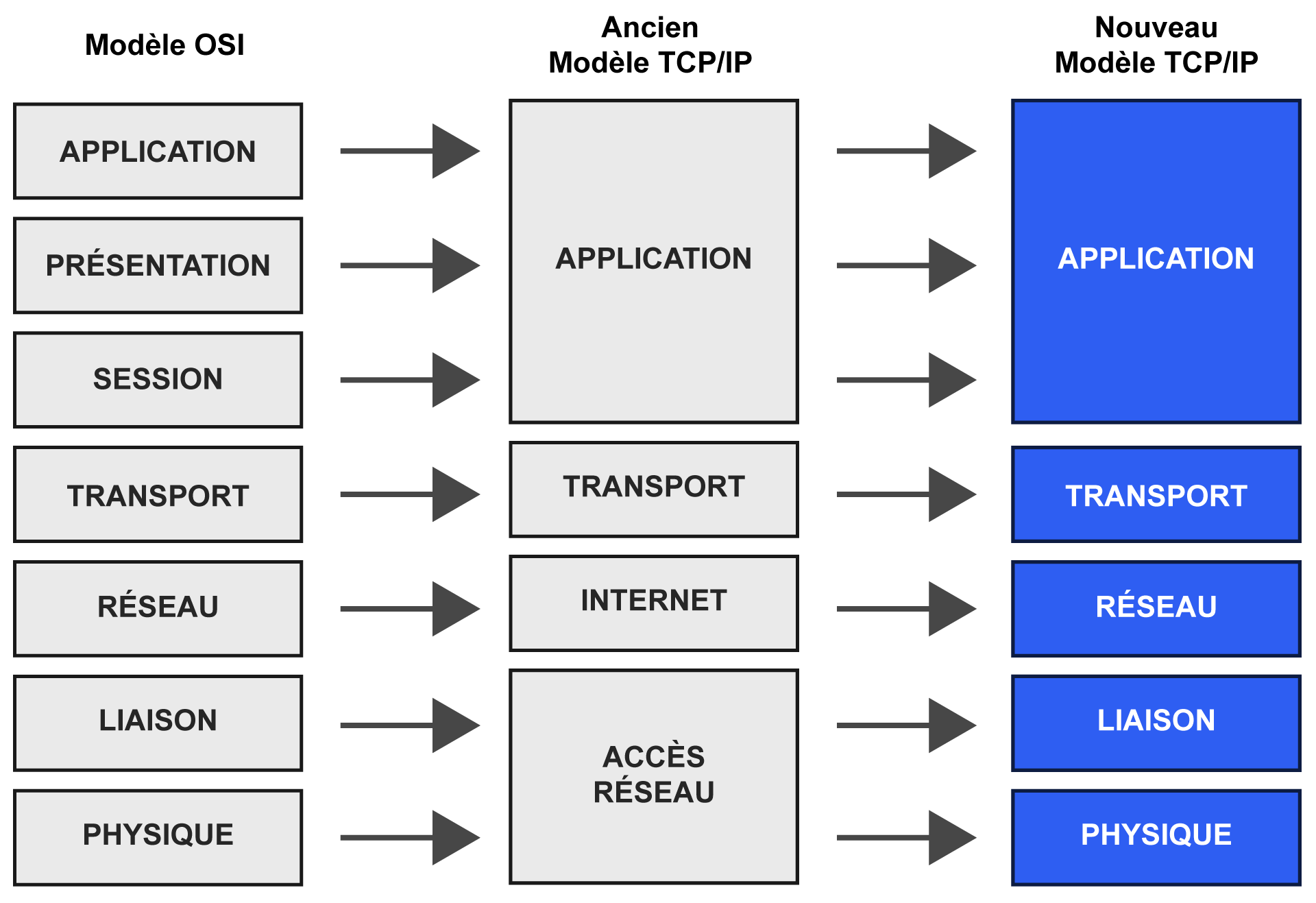 Dans ce « Nouveau Modèle TCP/IP », seules les 2 premières couches du modèle OSI sont présentes.