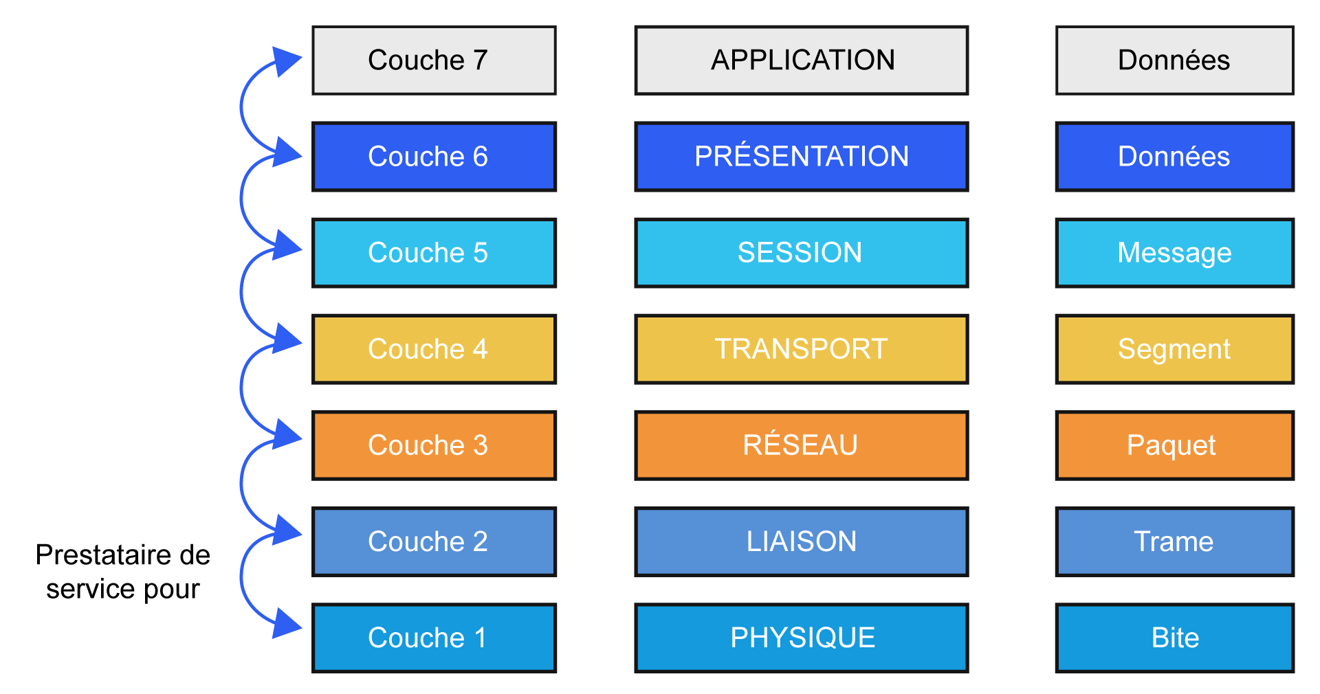 Quand en tant qu’humain, on envoie une information comme par exemple un e-mail, l’information est transmise à la couche 7 qui va effectuer un travail sur l’information que l'on envoie, puis l’envoyer à la couche 6 qui elle aussi va effectuer un travail, elle effectue un travail pour que l’information qu’elle a reçu de la couche 7 puisse arriver sans soucis, elle est donc prestataire de service pour la couche 7.