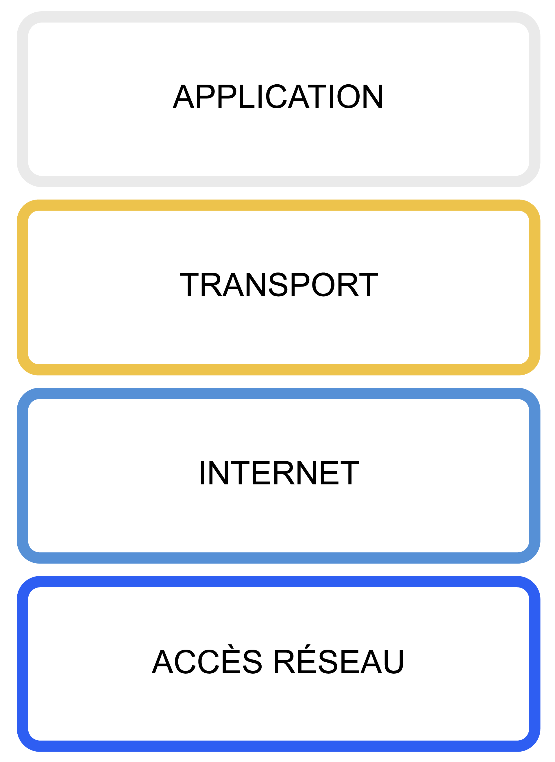 En revanche, les couches "Session", "Présentation" et "Application" ne sont pas très intéressantes en termes de réseau et sont maintenant regroupées en une seule et même couche « Application ». L’implémentation du modèle TCP/IP est conservée.