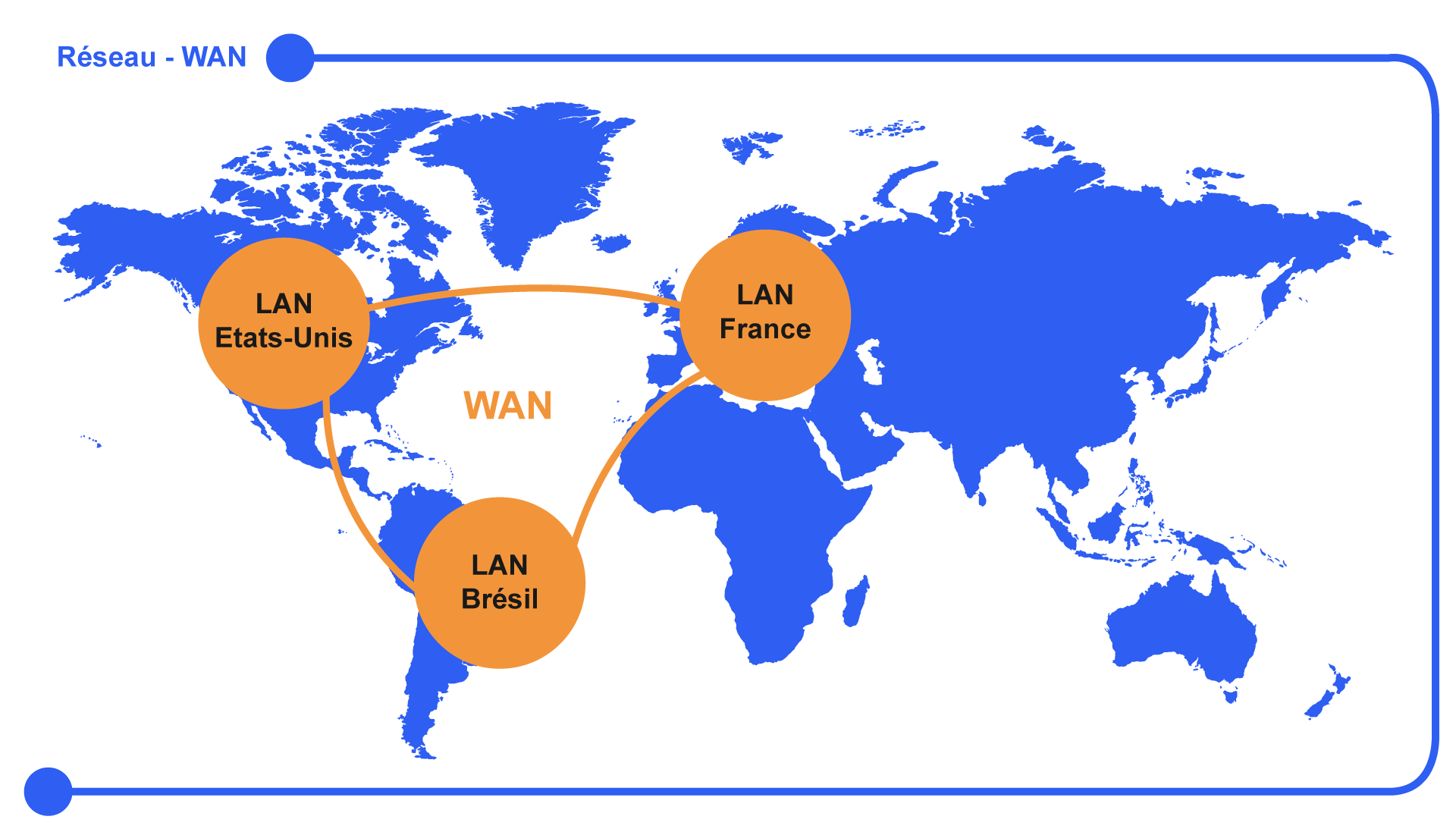WAN pour Wide Area Network correspond à un réseau étendu, et il s'agit d'un réseau étendu à l'échelle d'un pays ou d'un continent puisqu'il peut couvrir des centaines ou des milliers de kilomètres.