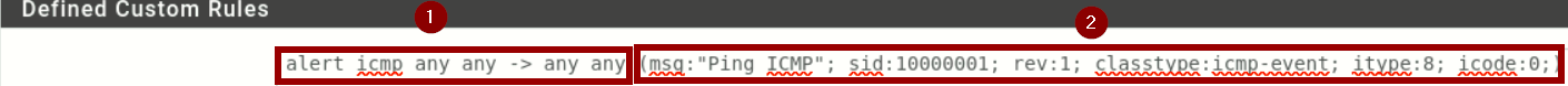 La première partie constitue l'en-tête, elle contient des informations sur l'objectif de la règle : alert, le protocole réseau : icmp, l'adresse ip et le port source et destination : any.