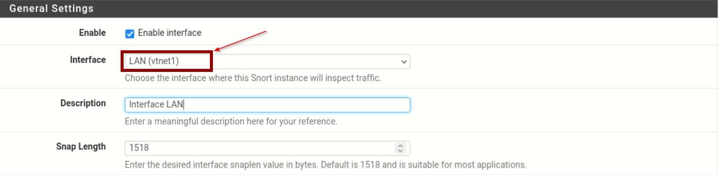 Différentes informations sur l'interface sont à configurer. Dans un premier temps, l'interface à écouter doit être définie. On spécifie ici l'interface LAN qui sera écoutée.