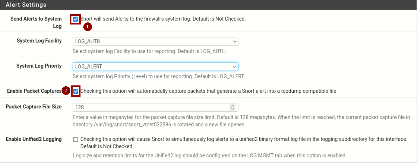 Ensuite, on va configurer les modalités d'alertes. En utilisant Snort par le biais de PFsense, il est possible d'intégrer les alertes Snort dans les journaux d'un Firewall, ainsi que de générer un fichier compatible avec Wireshark et tcpdump.