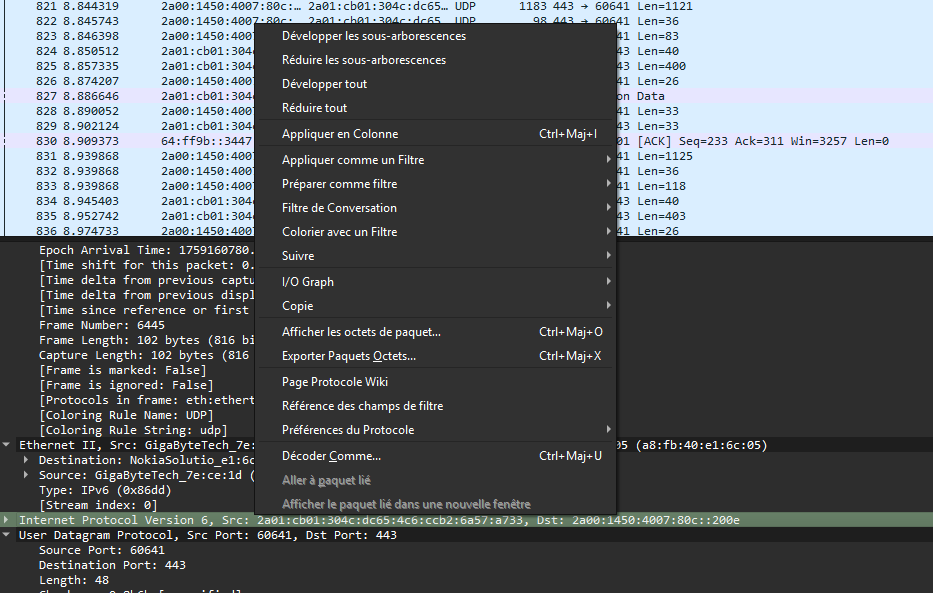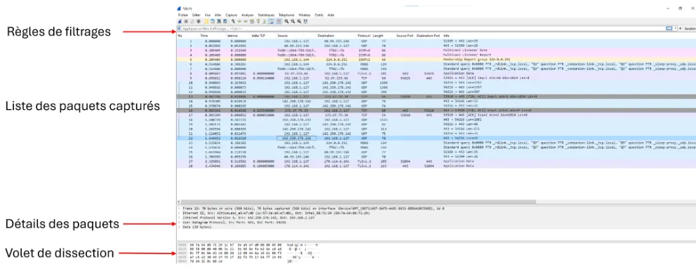 Pour une analyse approfondie, le volet des détails des paquets montre les informations par protocoles et couches.