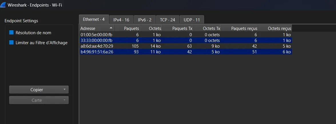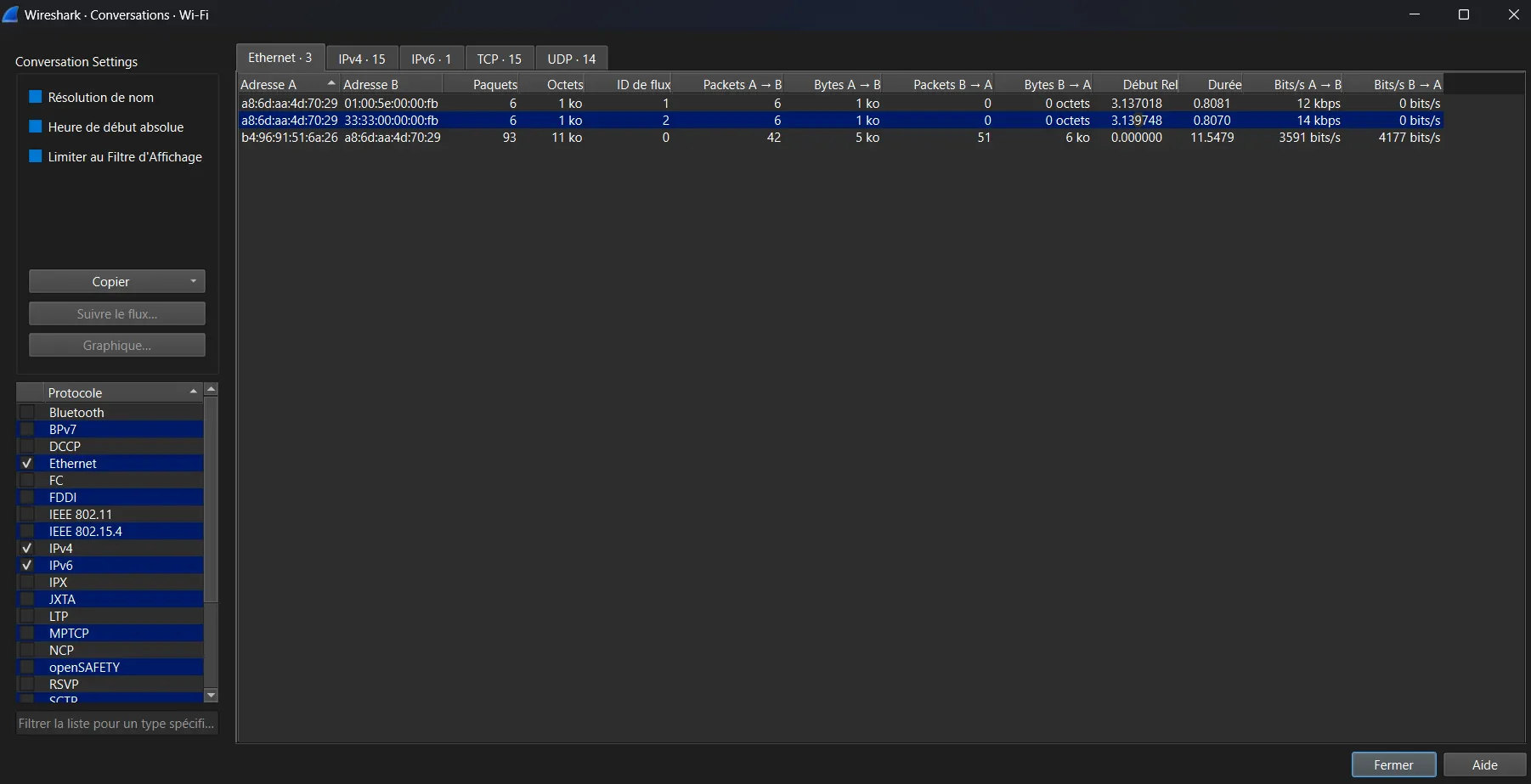 Cette fonctionnalité permet de mettre en avant les différentes machines qui ont communiqué entre elles, en les identifiant par leurs adresses IP et MAC. On peut également voir le nombre de messages envoyés et la taille des paquets. Si on suspecte la compromission d'une machine, cet outil peut s'avérer précieux pour aider à la détection et à l'analyse des comportements anormaux. Cela permet de suivre les communications suspectes et d'identifier d'éventuelles menaces sur le réseau.