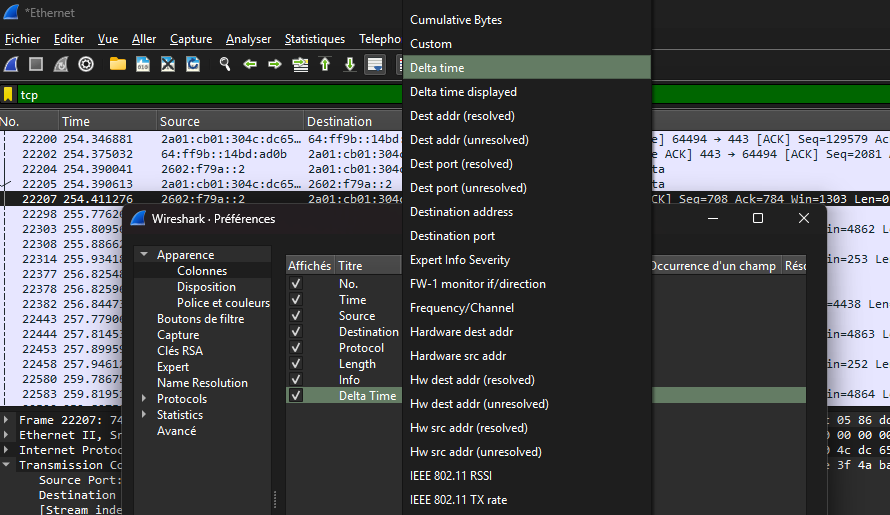 Dans une analyse réseau, le facteur temps est crucial. C’est pourquoi, par défaut, la colonne Time est mise en avant. Cependant, cette colonne n’est pas toujours la plus adaptée lorsqu’il s’agit de mesurer des délais. Il peut être intéressant d’ajouter une colonne supplémentaire, comme Delta Time, pour une analyse plus précise.