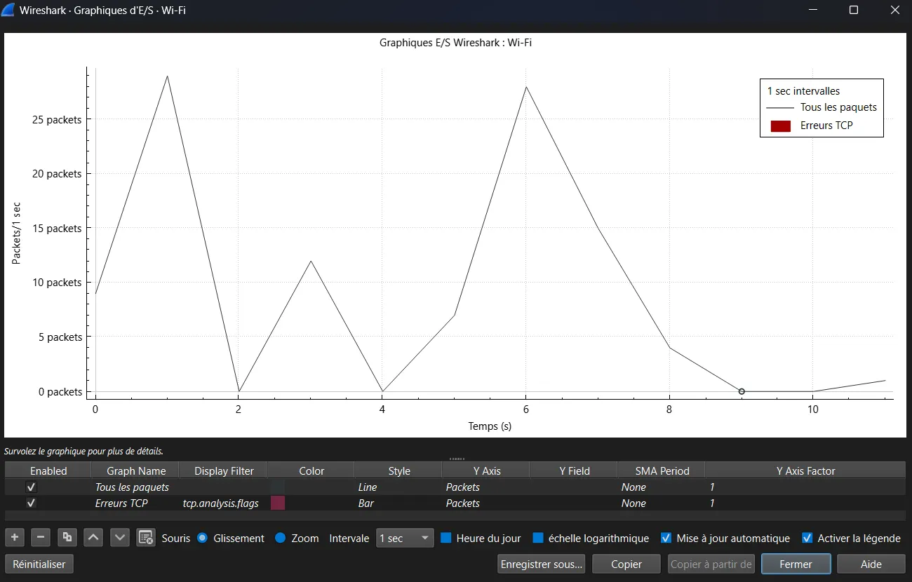 Le graphique d'entrée-sortie visualise la distribution temporelle des paquets sur le réseau. Il met en évidence les périodes d'activité forte et faible, permettant d'identifier rapidement les tendances, pics de trafic et anomalies potentielles pour détecter les problèmes de performance ou de sécurité.