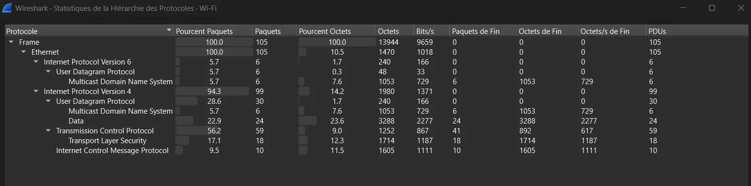La hiérarchie des protocoles affiche la répartition et le poids des protocoles dans la capture. En comparant avec les utilisations habituelles du réseau, elle permet d'identifier des anomalies potentielles comme les attaques DDoS, ping of death ou les scans réseau.