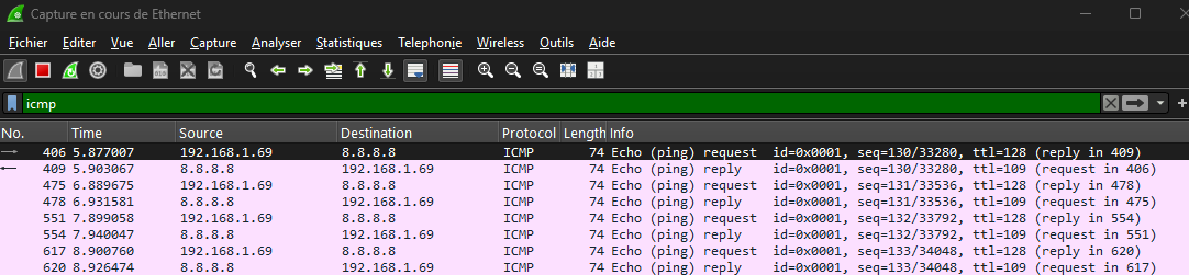 Dans Wireshark, cette latence s'observe via ICMP et TCP, le protocole ARP ne fournissant pas d'information temporelle.
