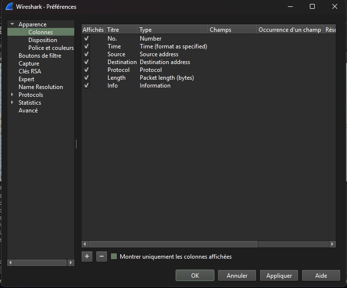 - Seconde méthode : Éditer -> Préférences -> Apparence -> Colonnes