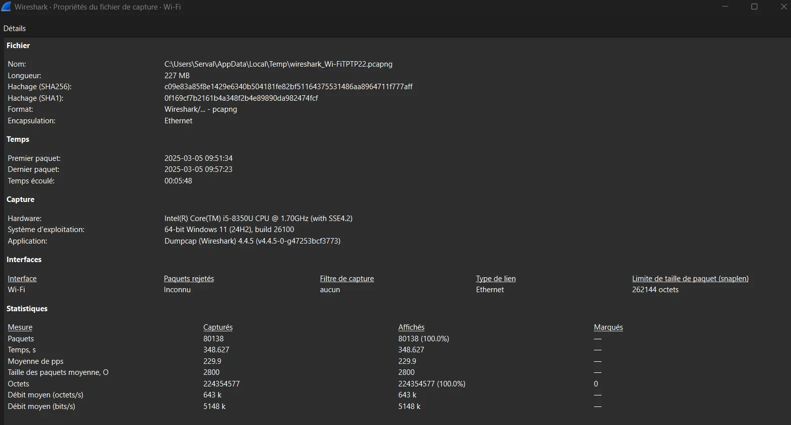 Dans l'onglet Statistiques, on trouve Propriétés du fichier de capture. Cette section fournit des informations complémentaires sur la capture que l'on analyse, telles que la date de la capture, le nombre de paquets, la durée de la capture, et d'autres détails pertinents. Ces données pourront aider à contextualiser l'analyse et à mieux comprendre le trafic enregistré.